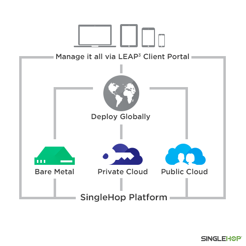 The SingleHop platform enables the deployment of virtualized infrastructures from bare metal platforms, public clouds, private clouds as illustrated below: