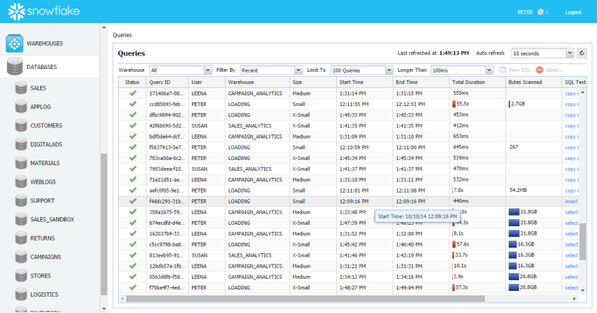 Today, Snowflake Computing emerged from stealth to announce the Snowflake Elastic Data Warehouse, branded as the first data warehouse designed specifically for the needs of cloud computing infrastructures. The Snowflake Elastic Data Warehouse absolves customers of the hassle of managing an on premise data warehouse by providing a data warehouse as a service. Moreover, the platform’s patent pending technology delivers a SQL-compliant data warehouse that elastically scales in conjunction with the number of users, incoming data and workloads. The platform’s “multidimensional elasticity” enables users to load and query data concurrently with a degree of performance that enables rapid ingestion and transformation of data into a relational database structure. Meanwhile, the product decouples storage from computational power in the context of a larger architecture dedicated to optimizing cloud storage and querying capabilities. Customers interact with data stored in the Snowflake Elastic Data Warehouse via a SaaS user interface that delivers query results as illustrated by the screenshot below: