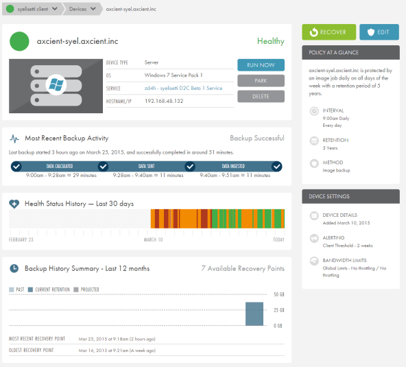 Cloud-based recovery as a service leader Axcient today announces a Direct to Cloud offering that enables customers to replicate their IT infrastructure in the cloud without use of an appliance. Axcient’s Direct to Cloud platform allows customers to replicate their servers, desktops and laptops within Axcient’s cloud environment to ensure the continuity of business operations and enhance the operational agility of end users. The Axcient Business Recovery Cloud allows customers to create a replica of their entire infrastructure by way of an internet connection that creates an initial snapshot of an infrastructure at a designated point in time, and then subsequently creates incremental backups in tandem with customer requirements. In contrast to replicating swaths of files, the Axcient Business Recovery Cloud creates a cloud-based copy of the physical and virtual servers, laptop images and desktops. Customers can monitor the health of their cloud infrastructure by means of an Axcient dashboard as represented below: