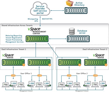 vSpace’s integration into NComputing’s Desktop as a Service offering is illustrated below: