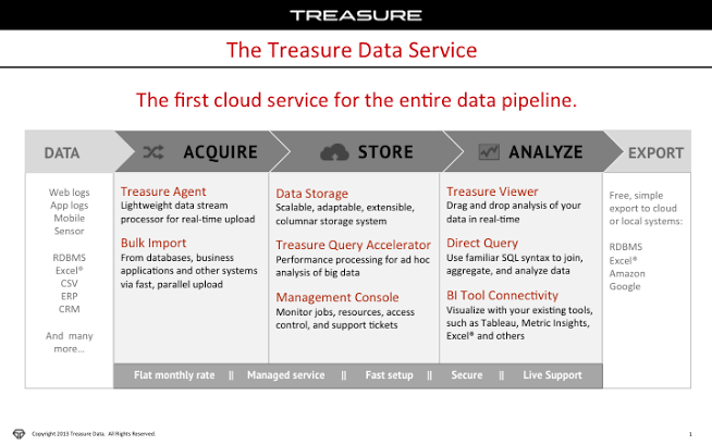 As the graphic indicates, the Treasure Data service features two modalities of acquisition: deployment of a code-based “Treasure Agent” designed to collect real-time streaming data, or a bulk import from databases or applications by means of a parallel loading process. Customers have the option of filtering incoming data or storing it raw, within Treasure Data’s “proprietary database technology as well as Hadoop components.” Once data has been successfully loaded, customers can analyze the data using Tableau’s integrated technology, Treasure Viewer, SQL queries. Metric Insights or Excel.