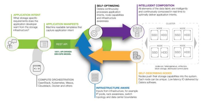 Mountain View, CA-based Datera emerged from stealth today with the launch of the Datera Elastic Data Fabric platform, a scale-out storage software solution that delivers block storage provisioning and management capability for commodity hardware. Datera Elastic Data Fabric brings the operational agility and economics of public-cloud based block storage solutions such as the Amazon Web Services Elastic Block Storage platform to enterprises and service providers by empowering them to use code to deploy and manage storage solutions. Customers use the Data Elastic Data Fabric to create storage infrastructures for private clouds, or in the case of service providers, large-scale storage infrastructures. As told to Cloud Computing Today in a phone interview with Datera CEO Marc Fleischmann, the platform boasts self-optimizing and infrastructure aware functionality that delivers an intelligent data fabric capable of responding to the unique requirements of individual applications as illustrated below: